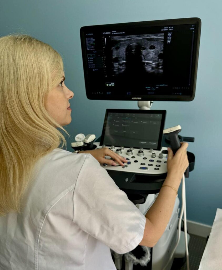 W gabinecie przy ul. Litewskiej 4b/10 dostępny jest nowoczesny aparat z funkcją badania elastograficznego guzków tarczycy. Lek. Aneta Kołodziej wykonuje na nim badanie USG tarczycy.